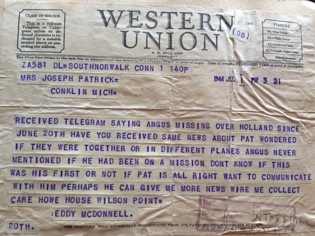 ![]() Telegram to ma Patrick from Angus McDonnell's family... His co pilot killed in action/ ditching. |