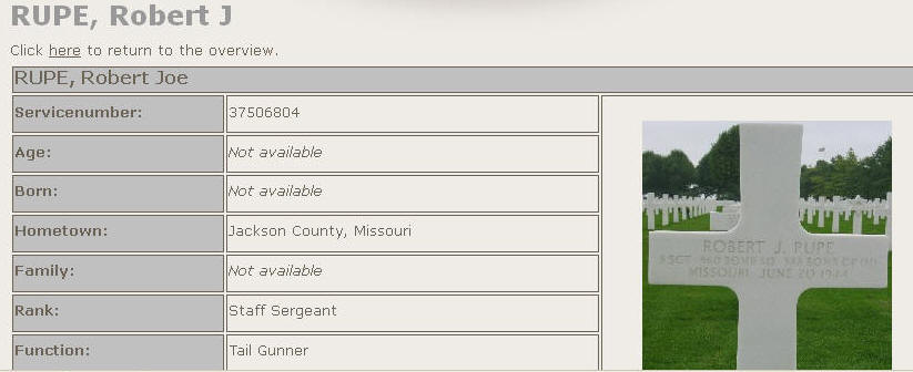 Robert Joe Rupe Hometown: Jackson County, Missouri sn 37506804 Staff Sergeant Tail Gunner |